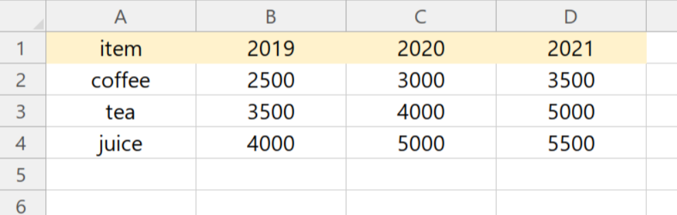 df = df.melt(id_vars = ['item'], value_vars=year, var_name = ['year'], value_name='price')