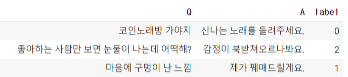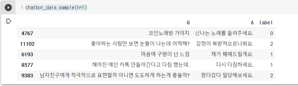데이터를 랜덤으로 5개의 행을 출력해본 결과, 위와 같이 'Q'라는 컬럼에 있는 한글 질의에 대해 'A' 컬럼에 답변 데이터가 있고, 'label' 컬럼에 해당 질의에 대해 일상 대화인지, 연애 관련 대화 중 이별(부정)에 관한 대화인지, 사랑(긍정)에 관한 대화인지 라벨링 되어 있음을 확인할 수 있다.