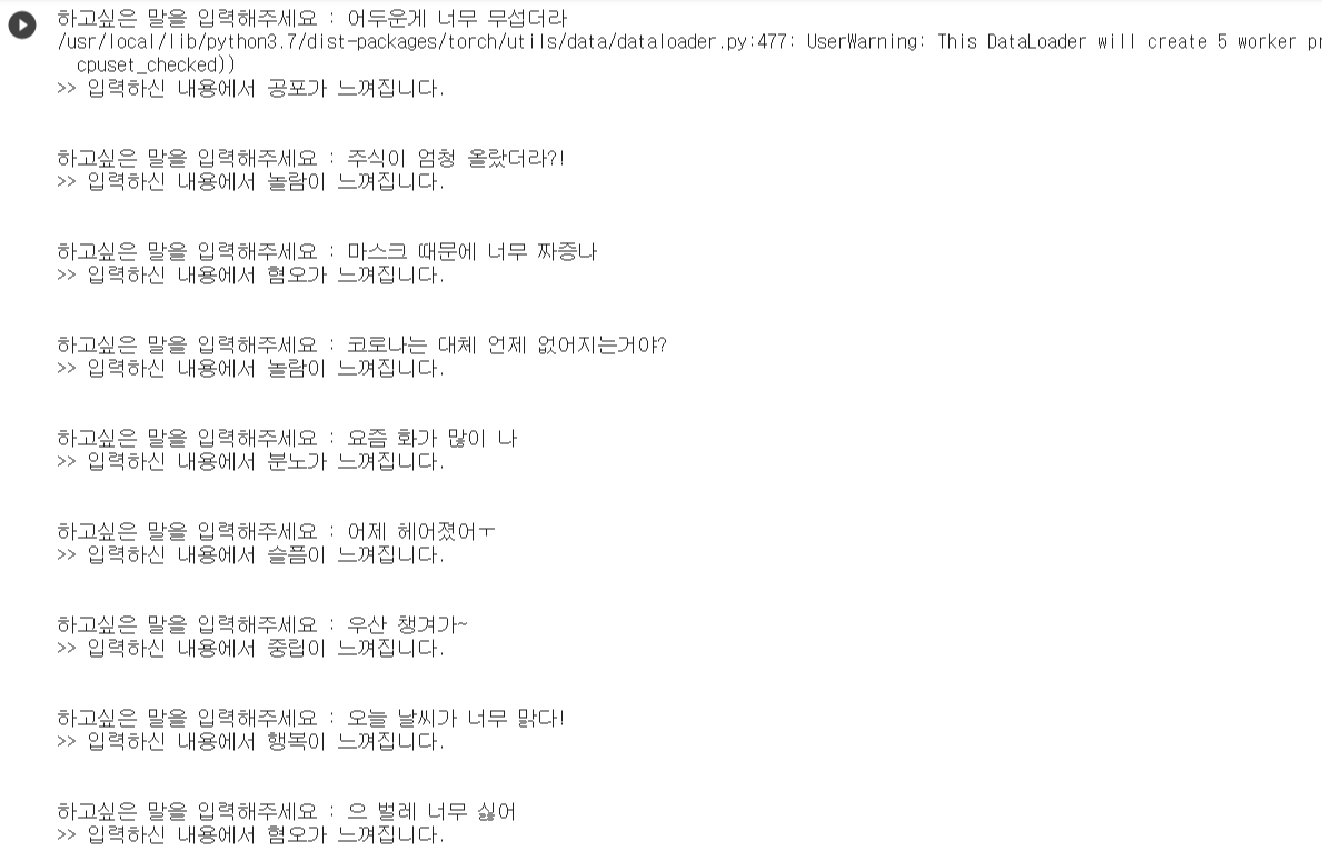 앞서 KoBERT 모델을 학습시킬 때, test dataset에 대해서 정확도가 매우 낮아서 과연 예측이 잘 될까 생각했는데, 의외로 감정이 잘 예측되었다. 추가로 더 문장을 테스트 해본 결과, 100% 정확하진 않아도 비슷한 결의 감정으로 예측이 되었다. 예를 들자면 공포의 감정이 느껴지는 텍스트를 행복이 아닌 혐오, 놀람과 같은 감정으로 예측되었다. 이를 통해 어느정도 긍정/부정의 분류는 잘 이루어지는 것 같다.