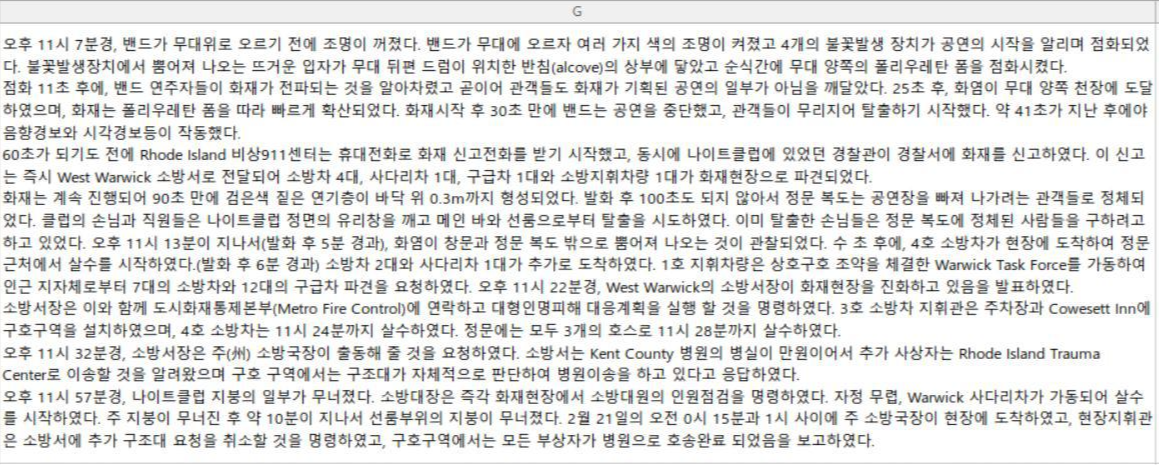 이렇게 이 데이터는 글로 정리가 되어있는데요, 아마 앞에서 읽은 '화재사례 목록 검색어 자료' 데이터가 이러한 자료를 기반으로 자연어 처리를 통해, 빈도에 따른 중요도로 키워드가 정리가 되지 않았을까 싶습니다.