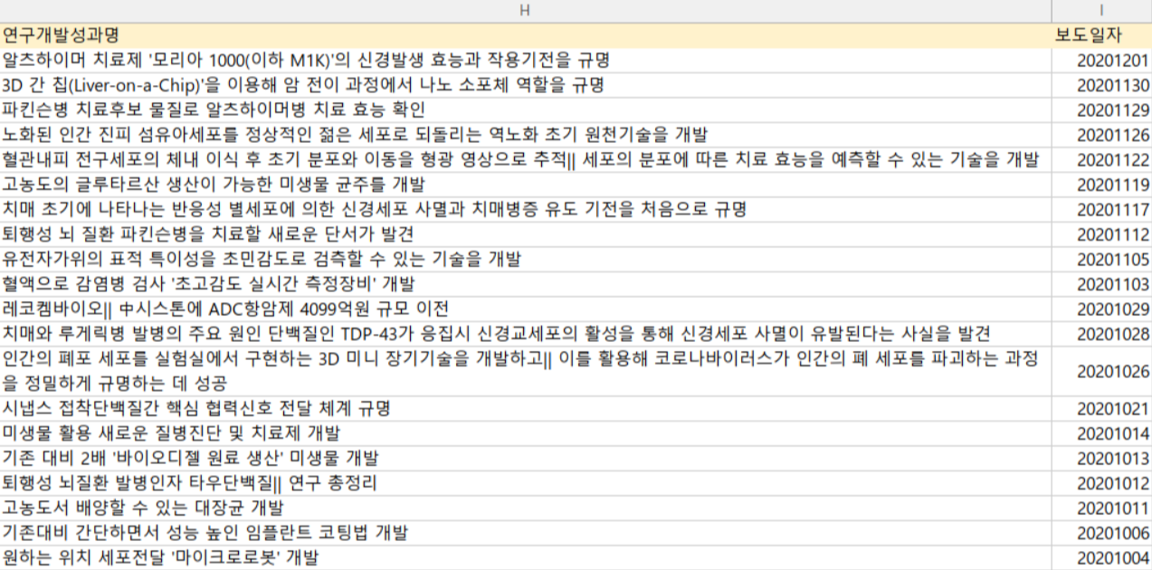 위 데이터는 보도일자를 최신순으로 정렬한 뒤 연구개발 성과명 칼럼의 상위 20개 데이터입니다. 보도 일자를 최신순으로 정렬하니 시간의 흐름에 따라 점점 어떠한 바이오 연구 개발이 이루어져 있는지 확인할 수 있게 되었습니다. 상위 데이터를 보면 알츠하이머 치료제, 간 칩, 세포 기술 등에 대한 연구 개발 내용이 있는데요, 점점 나노 단위의 기술이 발전되고 있는 것 같네요~