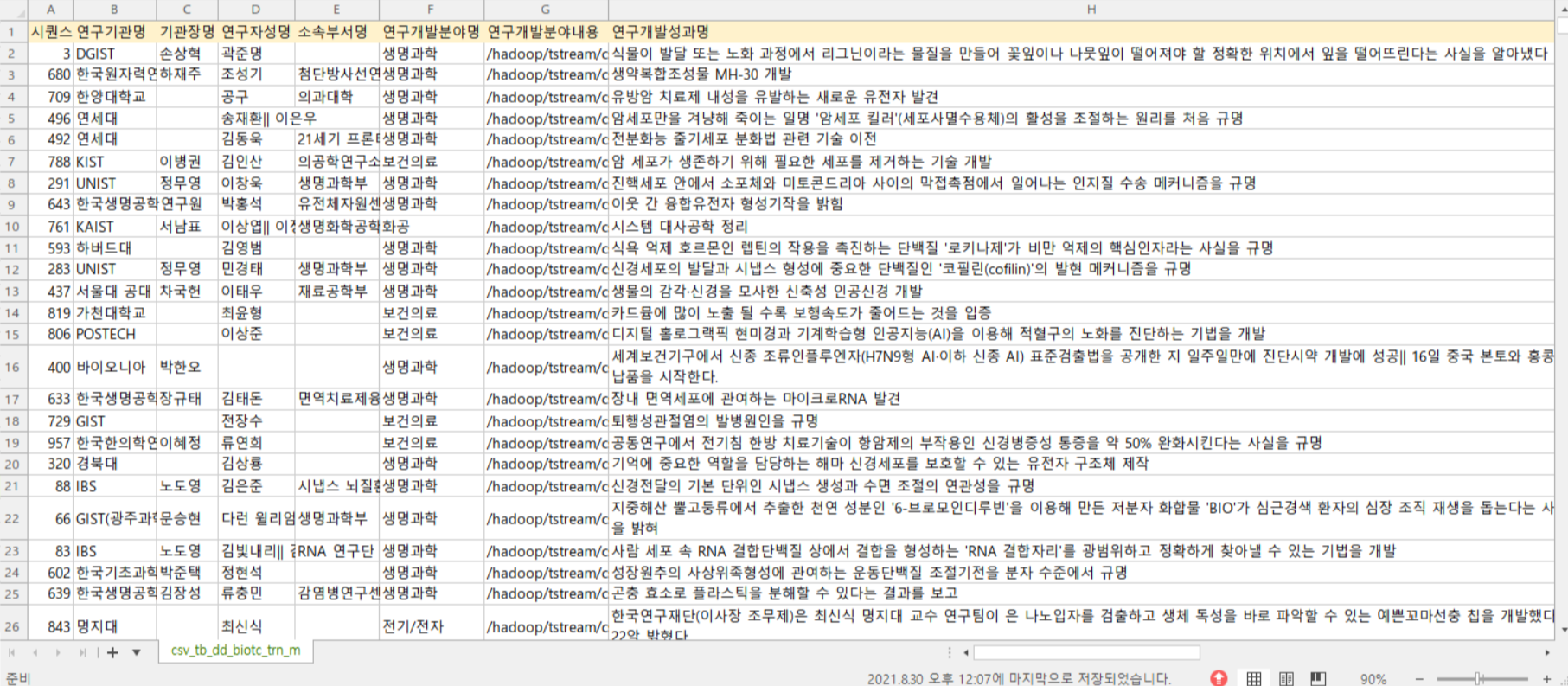 '바이오 기술 동향 데이터'는 csv 파일로 이루어져 있는데요, 다운로드 받은 데이터를 살펴보도록 하겠습니다.