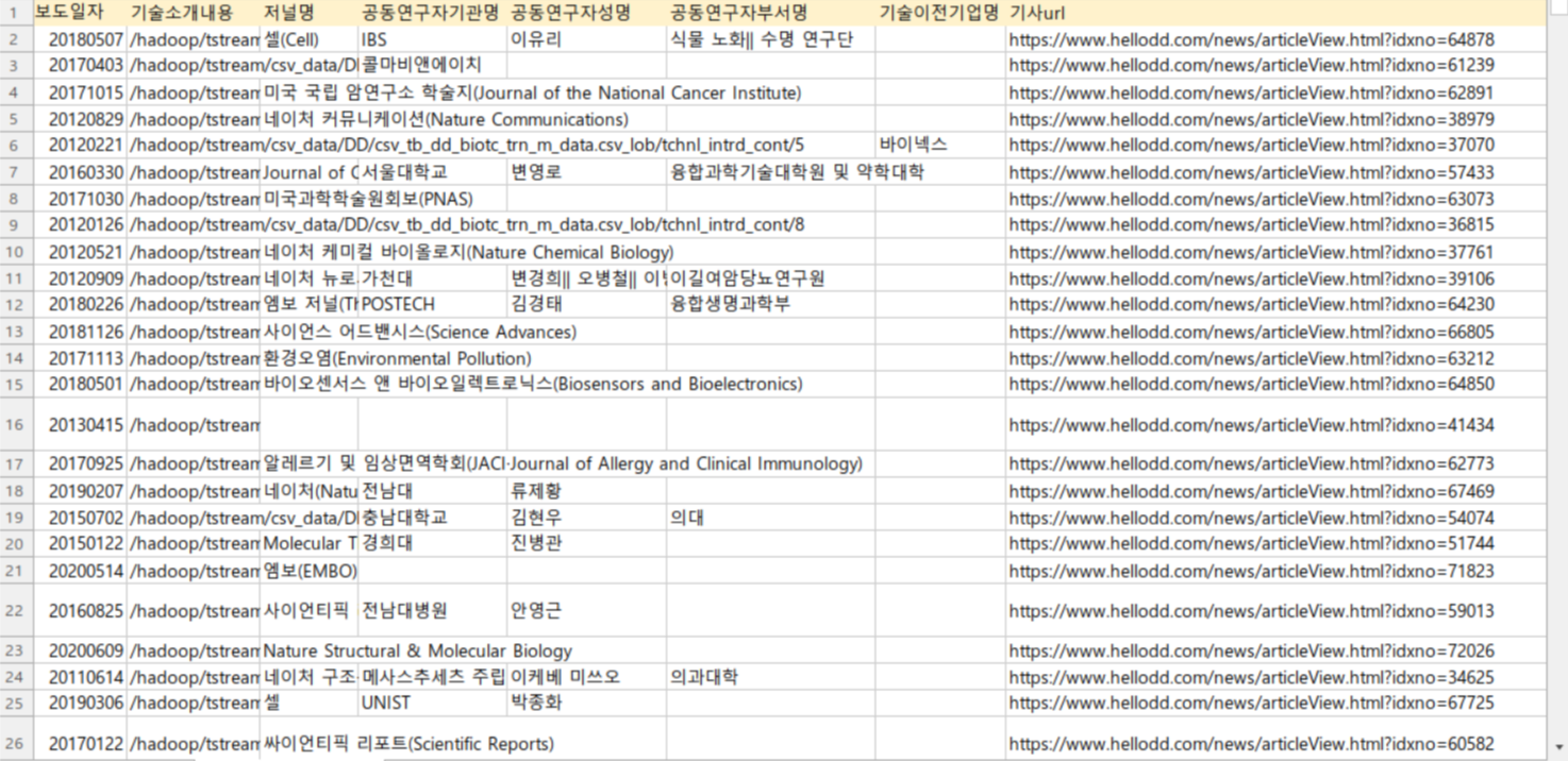 - 칼럼 : 시퀀스, 연구기관명, 연구자성명, 소속부서명, 연구개발 분야명, 연구개발 성과명, 보도일자, 기술 소개내용, 저널명, 공동연구자 기관명, 공동연구자 성명, 공동연구자 부서명, 기술이전 기업명, 기사 url