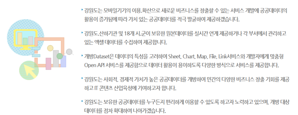 오늘 리뷰한 '강원도 인구 추이' 데이터는 <강원 공공데이터> 포털에서 다운로드 받은 데이터로, 강원 공공데이터 포털은 강원도가 보유한 공공데이터를 체계화하고 통합 및 개방하여 도민과 공유하고 민간의 활용 촉진을 위해 개발자 맞춤형 서비스를 제공하기 위해 구축된 공공데이터 개방 포털입니다.