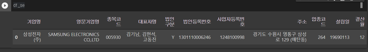 df_se = pd.DataFrame(columns=['기업명','영문기업명','종목코드','대표자명','법인구분',
