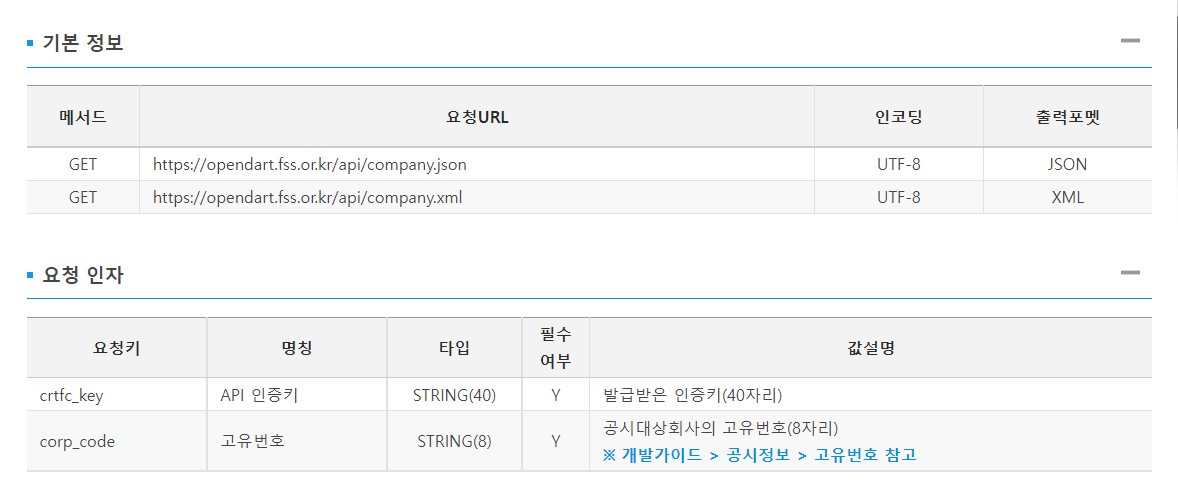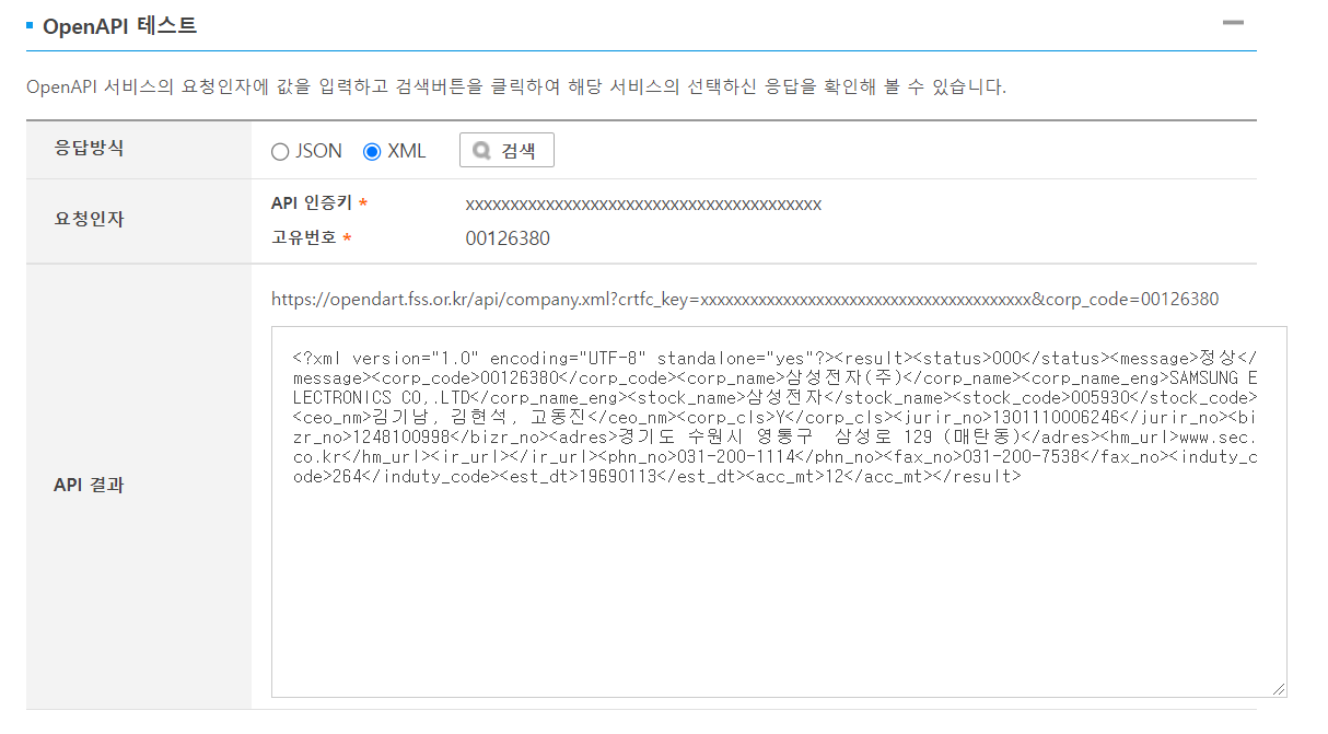 json, xml 형태 중 하나를 선택할 수 있으며 필수 요청인자로는 API 인증키와, 조회하려는 공시대상회사의 고유번호(8자리) 입니다.