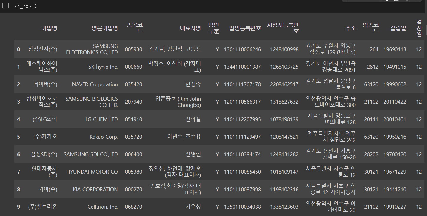 df_top10 = pd.DataFrame(columns=['기업명','영문기업명','종목코드','대표자명','법인구분',