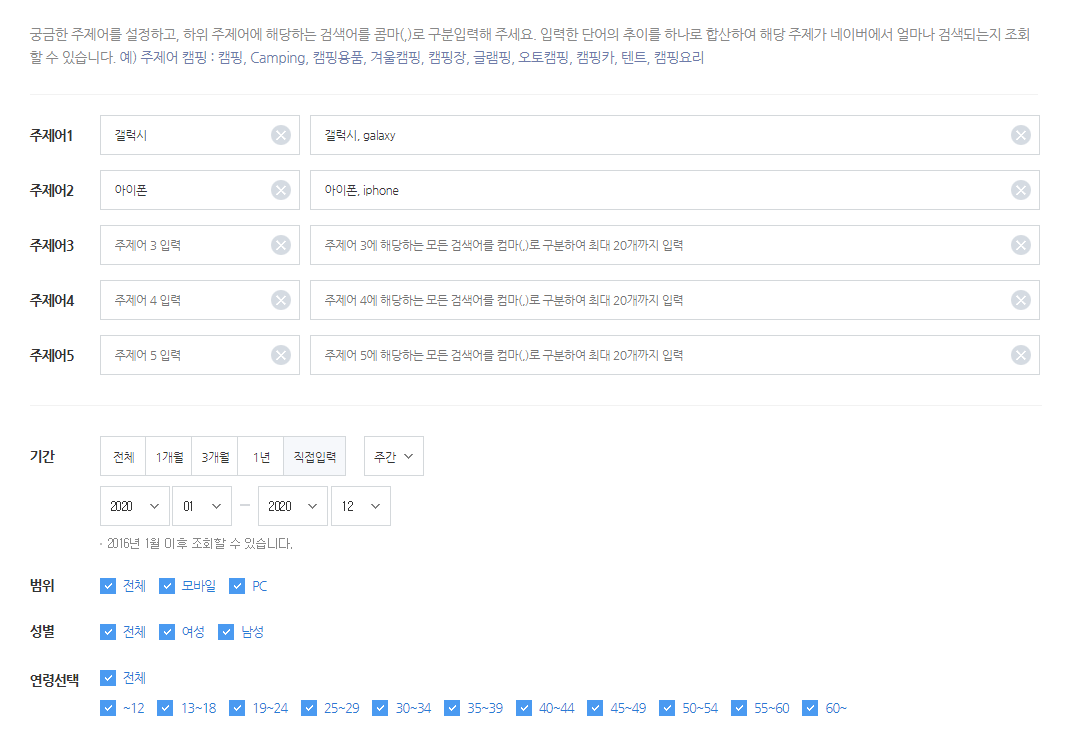 예제로는 2020년 "갤럭시", "아이폰"에 대한 모든 연령, 성별의 주간 검색 트렌드를 살펴보겠습니다.