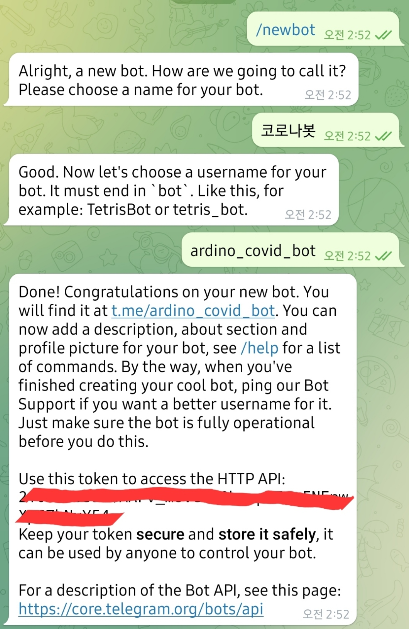 username을 입력하여 봇을 최종적으로 생성하게 되면 API 를 사용하는데 필요한 토큰을 확인할 수 있습니다.