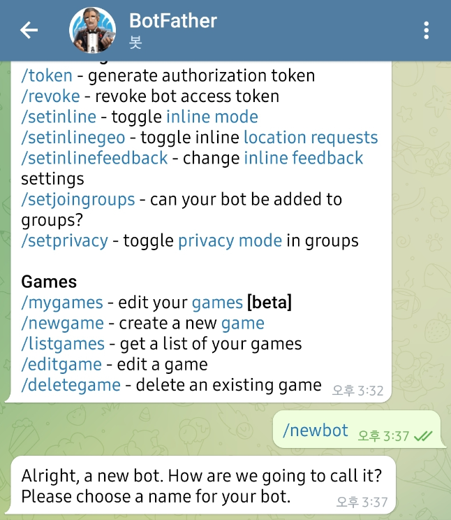 새로운 봇을 만들기 위해서는 여기서 /newbot 이라고 입력해줍니다.