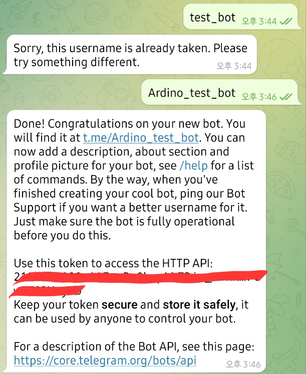 이번에는 Ardino_test_bot이라는 이름으로 username을 입력하겠습니다.