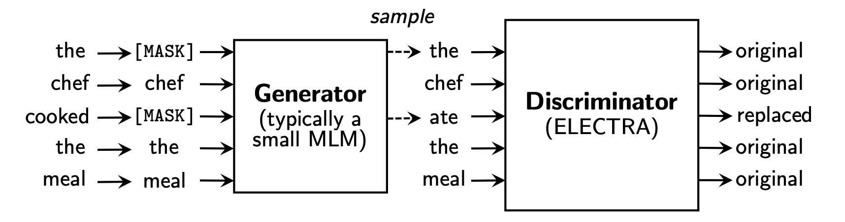 RTD 학습 방식을 좀 더 쉽게 설명하면, 가장 먼저 BERT 에서와 같이 입력된 토큰을 [MASK] 토큰으로 교체하여 완전히 마스킹하는 것이 아니라 Generator를 통해 다소 그럴 듯한 가짜 토큰으로 대체하는 방식으로 입력된 문장을 변형시킨다. 예를 들어, 위의 그림에서 "cooked"라는 토큰은 "[MASK]" 토큰이 아닌 "ate"라는 토큰으로 대체되었는데 이는 Generator에 의해 대체된 것이다. 이후에는 입력된 문장의 모든 토큰에 대해 실제 토큰인지 아니면 Generator를 통해 생성된 가짜 토큰인지 맞히는 이진분류 방식으로 Discriminator의 학습이 진행된다. 그리고 이러한 이진분류는 일부 토큰이 아닌 모든 토큰에 대해 진행되므로 기존의 MLM 방식보다 훨씬 효율적이면서도 효과적인 방식으로 모델을 학습할 수 있게 된다. 결과적으로 ELECTRA 는 RTD 라는 새로운 학습방법을 도입해 적은 계산량으로도 이전의 다른 모델과 비슷한 수준의 성능을 가지게 될 수 있었다.