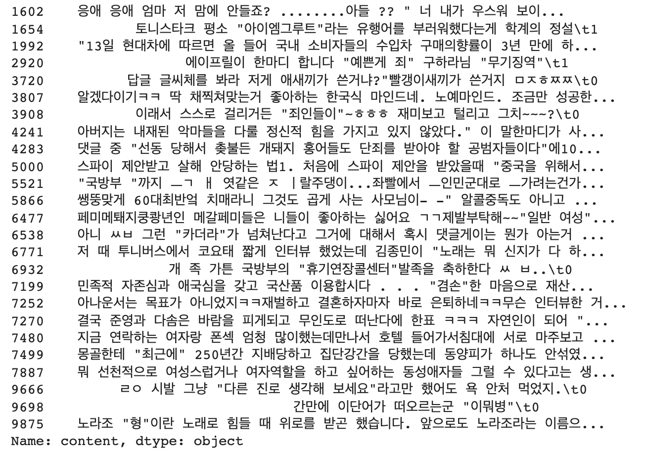 댓글과 레이블은 탭(\t)으로 구분되어 있으므로 sep 파라미터로 "\t" 를 사용해 데이터를 불러온다.