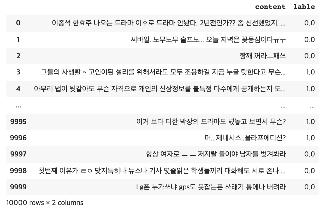 댓글 텍스트를 나타내는 content 는 10,000개의 데이터가 정확하게 로드되었지만, 악성댓글 여부를 나타내는 lable은 25개의 null 데이터가 존재하는 것을 확인할 수 있다.